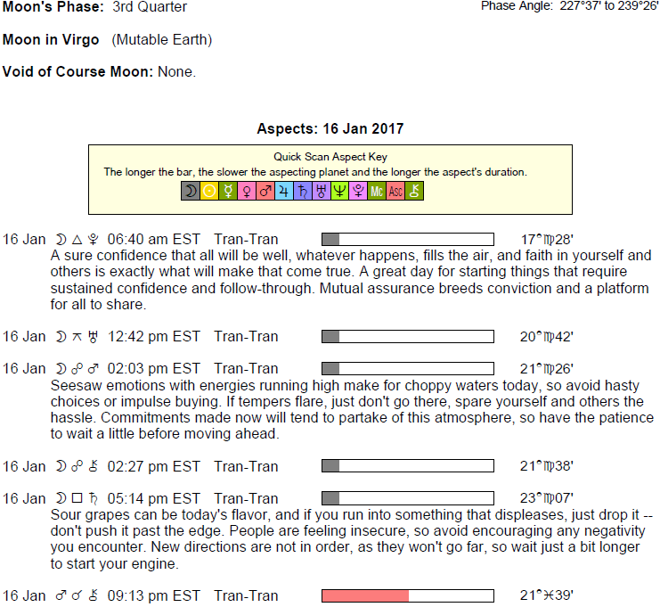 - The Moon is in Virgo all day (until Tuesday, January 17th, at 6:15 AM).