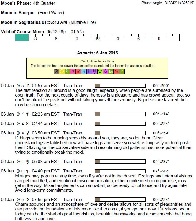 The following aspects (major only) and positions are at noon (EST) on January 6th: