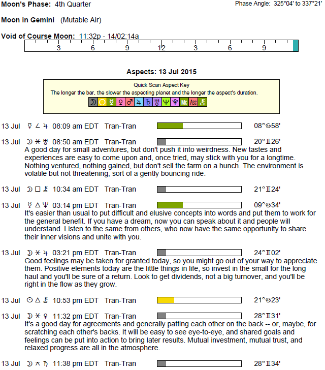 - The Moon is in Gemini all day (until Tuesday, July 14th, at 2:13 AM).