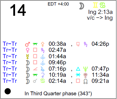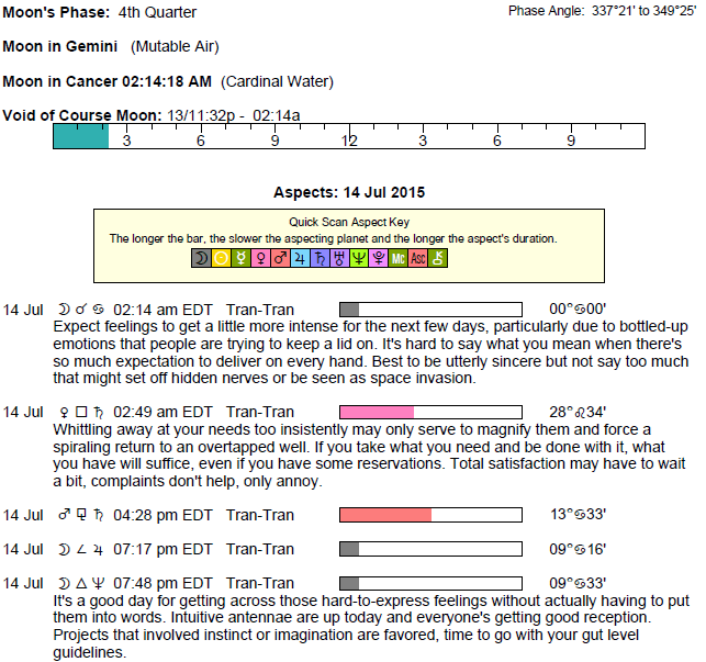 - The Moon is in Cancer from 2:13 AM forward (until Thursday, July 16th, at 10:14 AM).