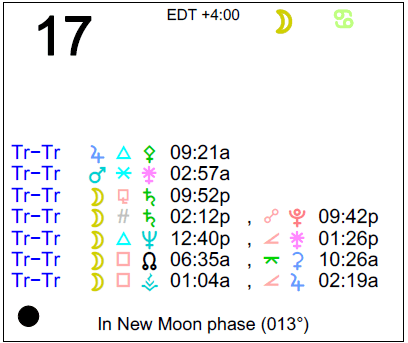 The following aspects (major only) and positions are at noon (EDT) on June 17th: