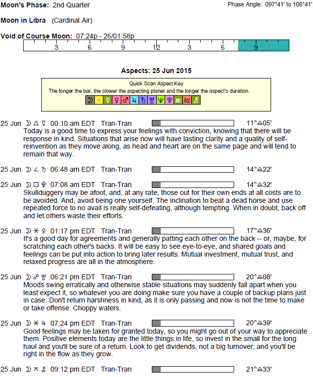 The following aspects (major only) and positions are at noon (EDT) on June 25th: