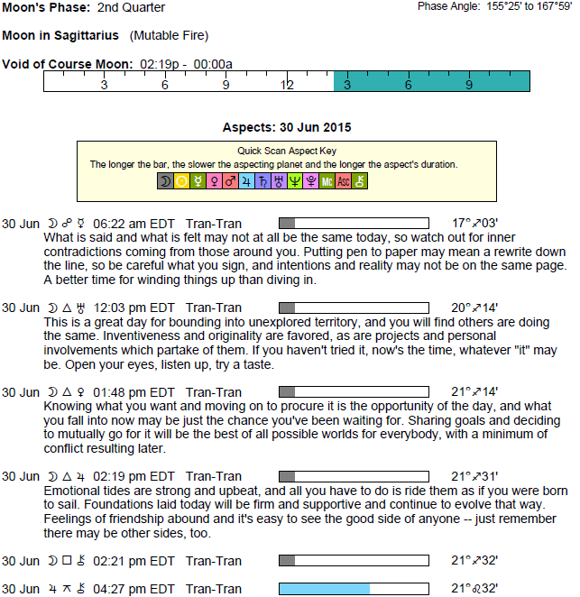 The following aspects (major only) and positions are at noon (EDT) on June 30th: