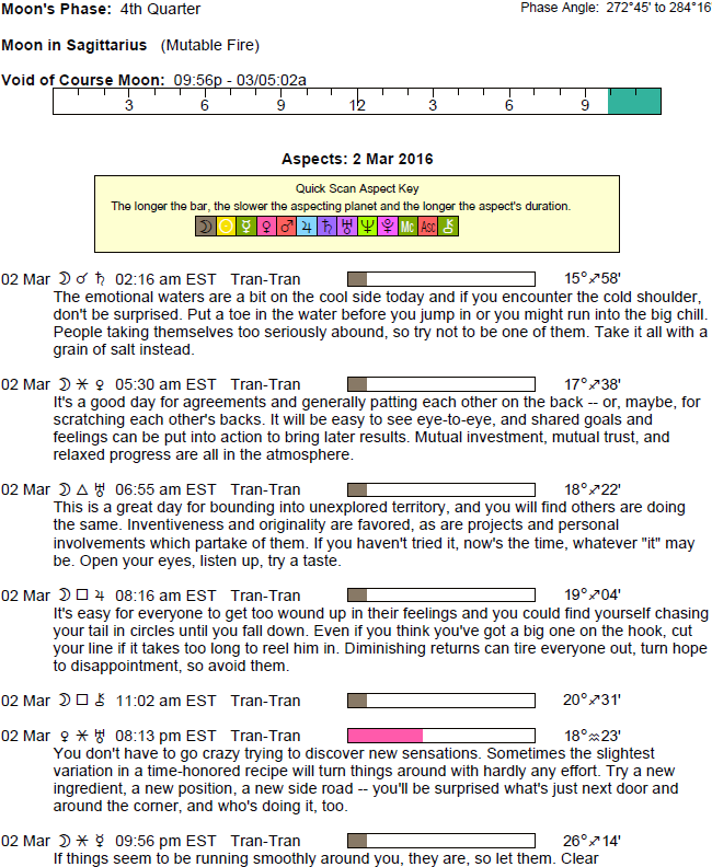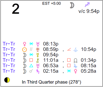 The following aspects (major only) and positions are at noon (EST) on March 2nd: