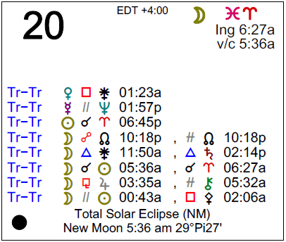 A total Solar Eclipse occurs in the last degree of the zodiac this morning, and this evening, the Sun enters the first degree of the zodiac, Aries, marking the beginning of the astrological new year. This is a powerful day of new beginnings and setting our intentions.