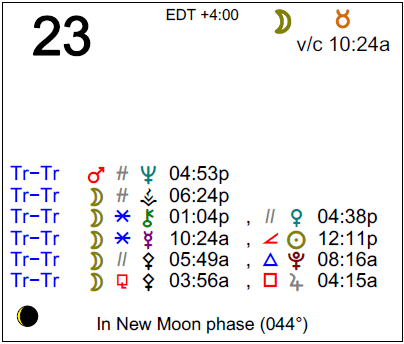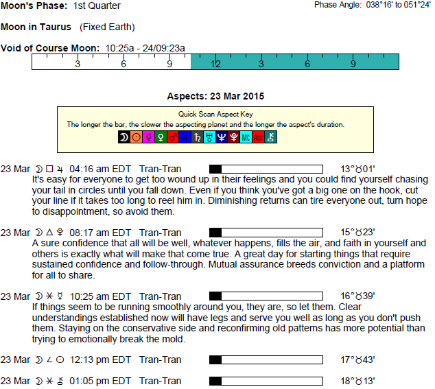 The following aspects (major only) and positions are at noon (EDT) on March 23rd: