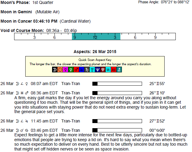 The following aspects (major only) and positions are at noon (EDT) on March 26th: