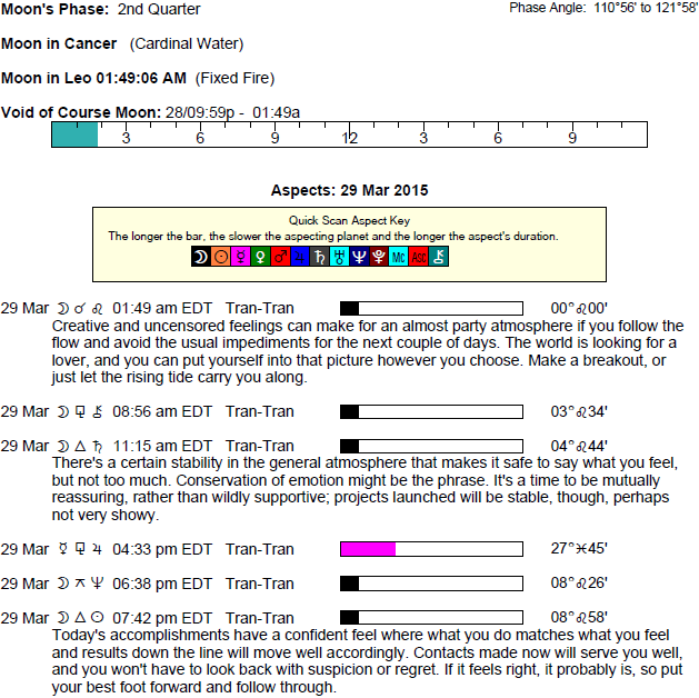 - The Moon is in Leo from 1:47 AM forward (until Tuesday, March 31st, at 2:12 PM).