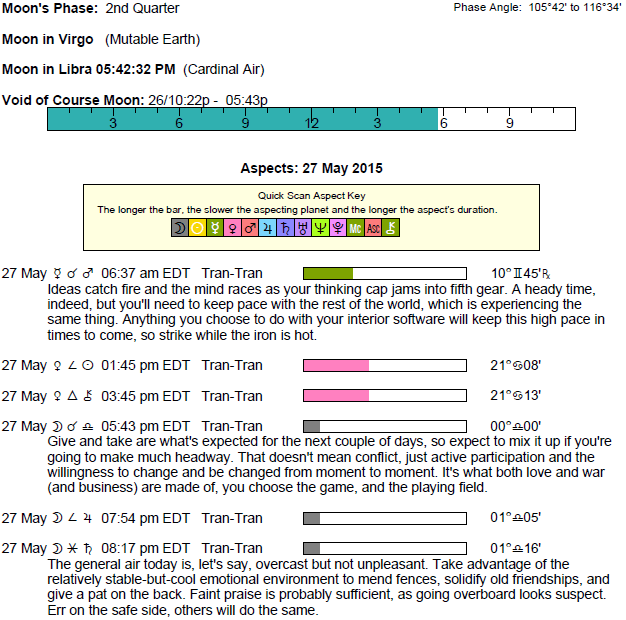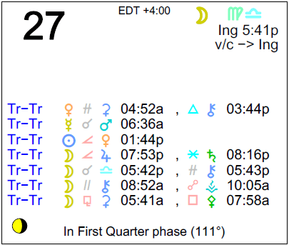 The following aspects (major only) and positions are at noon (EDT) on May 27th: