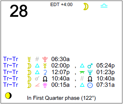 The following aspects (major only) and positions are at noon (EDT) on May 28th: