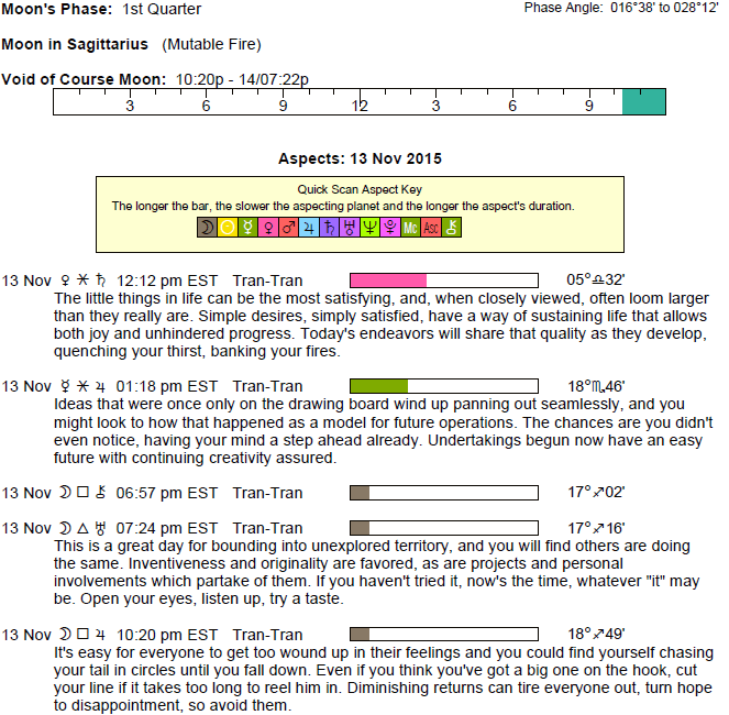 Note that the Moon moves at a rate of approximately one degree every 2 hours, so that if an aspect involving is applying and has an orb of 5 degrees, the aspect will perfect (be exact) in about 10 hours. If the Moon is separating from an aspect with an orb of 2 degrees, it has already formed said aspect approximately 4 hours ago (since the following are positions at noon today, then it would have occurred at about 8 AM today).