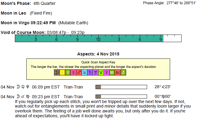 The following aspects (major only) and positions are at noon (EST) on November 4th: