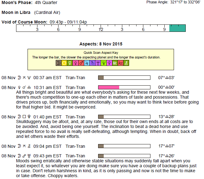 Note that the Moon moves at a rate of approximately one degree every 2 hours, so that if an aspect involving is applying and has an orb of 5 degrees, the aspect will perfect (be exact) in about 10 hours. If the Moon is separating from an aspect with an orb of 2 degrees, it has already formed said aspect approximately 4 hours ago (since the following are positions at noon today, then it would have occurred at about 8 AM today).