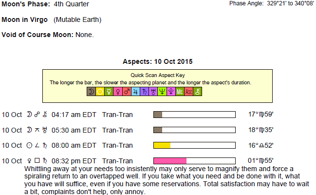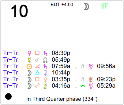 The following aspects (major only) and positions are at noon (EDT) on October 10th: