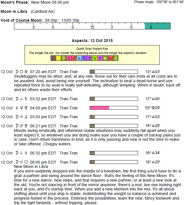 Note that the Moon moves at a rate of approximately one degree every 2 hours, so that if an aspect involving is applying and has an orb of 5 degrees, the aspect will perfect (be exact) in about 10 hours. If the Moon is separating from an aspect with an orb of 2 degrees, it has already formed said aspect approximately 4 hours ago (since the following are positions at noon today, then it would have occurred at about 8 AM today).