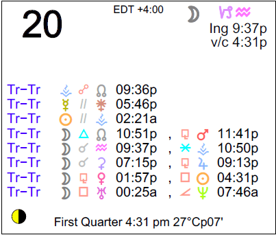 If you’re astrologically inclined and interested in the details of the Astrology of today, here are some of the factors considered in the forecasts (for the astrology of the week, see This Week in Astrology):