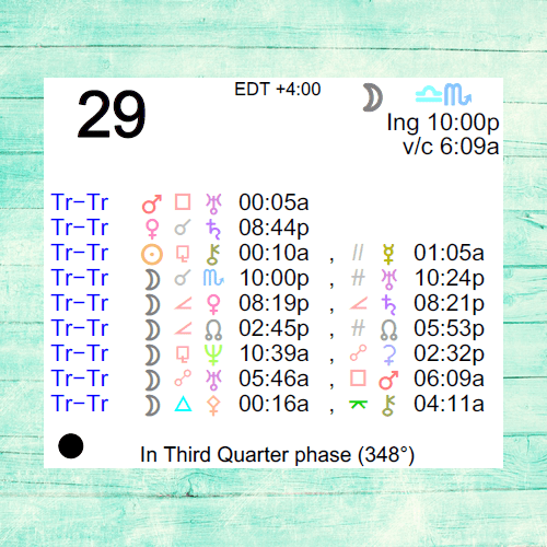 Contemplate the deeper things in life. Avoid unnecessary conflict, but if it’s going to improve your life, go ahead and make waves. Tune in to your intuition. This is a good time for investigations, looking into a matter further, doing research, connecting to others with a shared passion, solving a mystery, and devising a strategy. When the Moon in Scorpio is strained, we may take our passions too far.