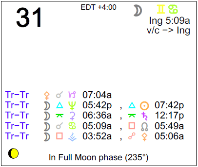 Note that the Moon moves at a rate of approximately one degree every 2 hours, so that if an aspect involving is applying and has an orb of 5 degrees, the aspect will perfect (be exact) in about 10 hours. If the Moon is separating from an aspect with an orb of 2 degrees, it has already formed said aspect approximately 4 hours ago (since the following are positions at noon today, then it would have occurred at about 8 AM today).