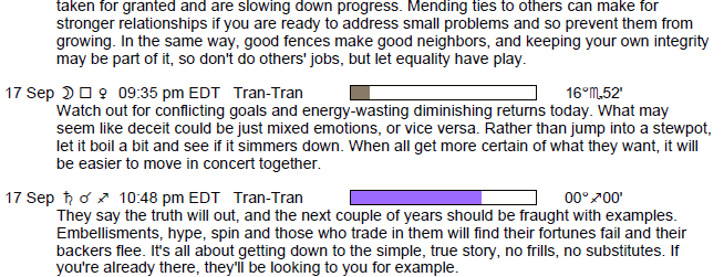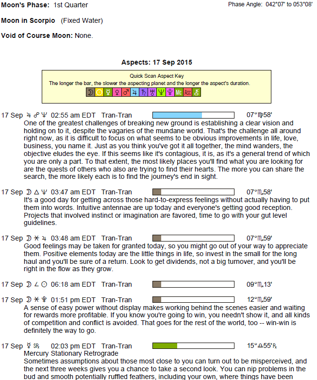 Jupiter opposes Neptune early into the day. I’ve discussed the Jupiter-Neptune opposition in the horoscopes for the 14th. Mercury turns retrograde today, which I’ve discussed in yesterday’s horoscopes (September 16th horoscopes – Mercury retrograde). Saturn re-enters Sagittarius today. Saturn first entered the sign of the Archer on December 23, 2014 but retrograded back into Scorpio on June 14, 2015. Saturn will now finish its transit of Sagittarius uninterrupted until December 20, 2017. (For more on the Saturn in Sagittarius transit, read my December 23 horoscopes and my Saturn in Sagittarius transit on Cafe Astrology).