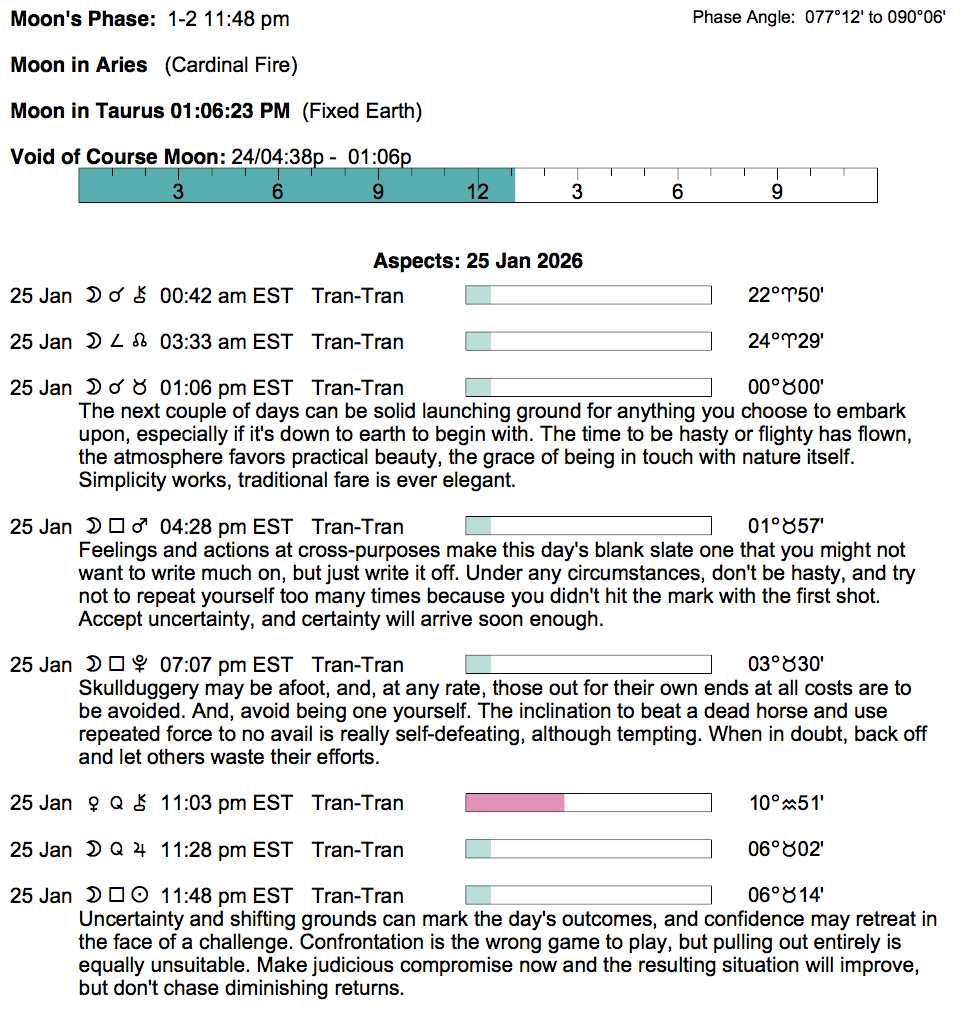 Planet Color Key: The longer the bar, the slower the aspecting planet, and the longer the duration of the planet’s transit.