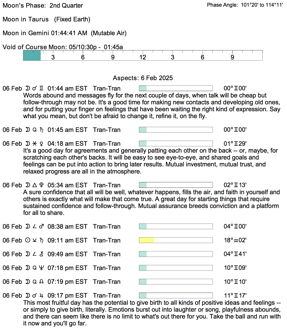 Planet Color Key: The longer the bar, the slower the aspecting planet, and the longer the duration of the planet’s transit.