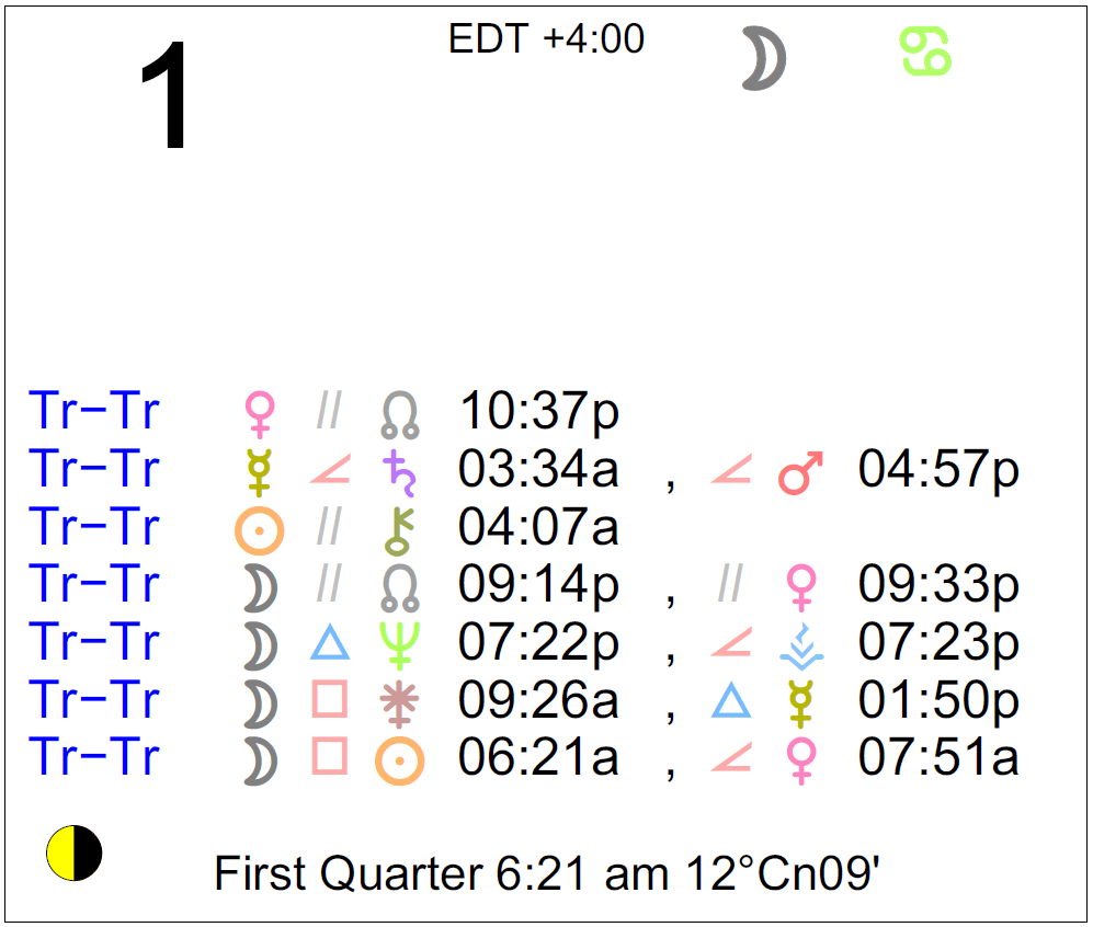 Planet Color Key: The longer the bar, the slower the aspecting planet and the longer the duration of the planet’s transit.