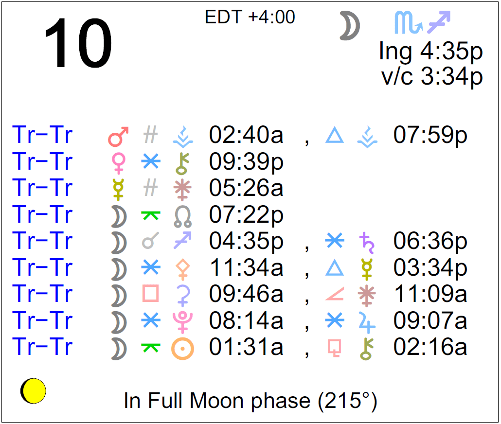 Planet Color Key: The longer the bar, the slower the aspecting planet and the longer the duration of the planet’s transit.