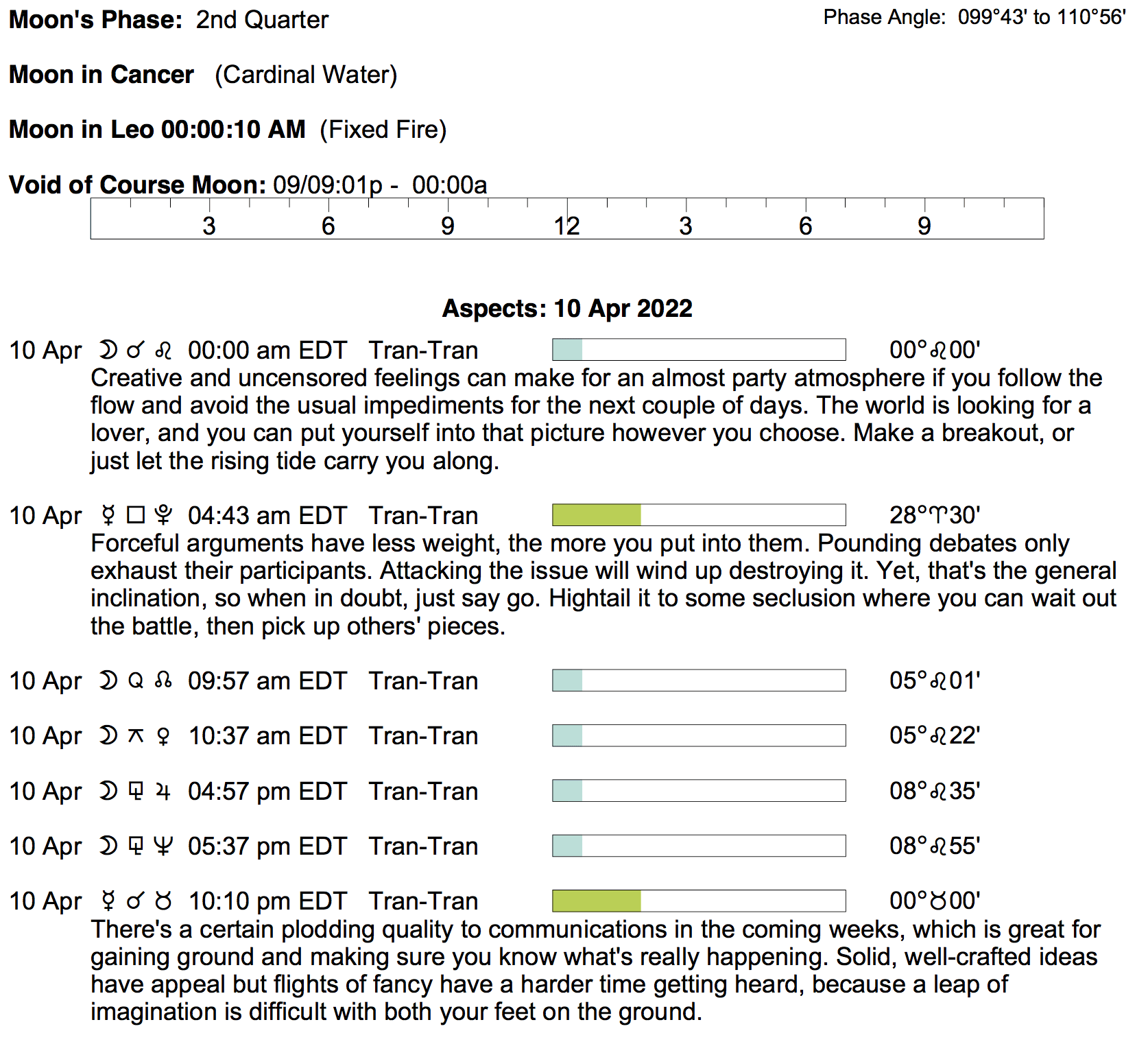 Planet Color Key: The longer the bar, the slower the aspecting planet, and the longer the duration of the planet’s transit.