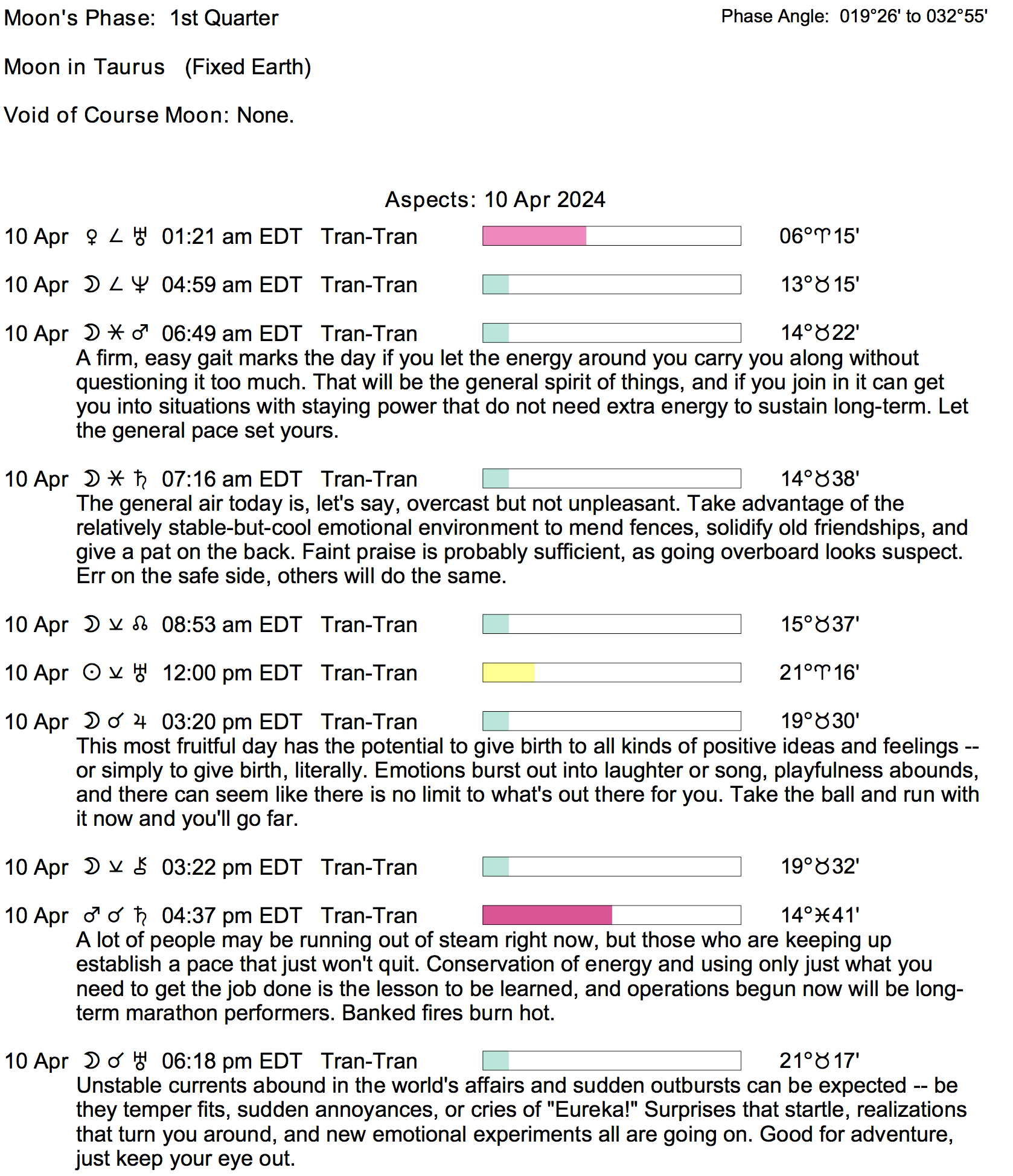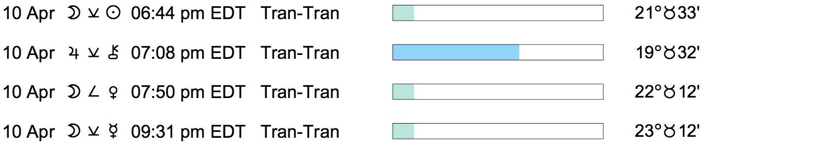 Planet Color Key: The longer the bar, the slower the aspecting planet, and the longer the duration of the planet’s transit.