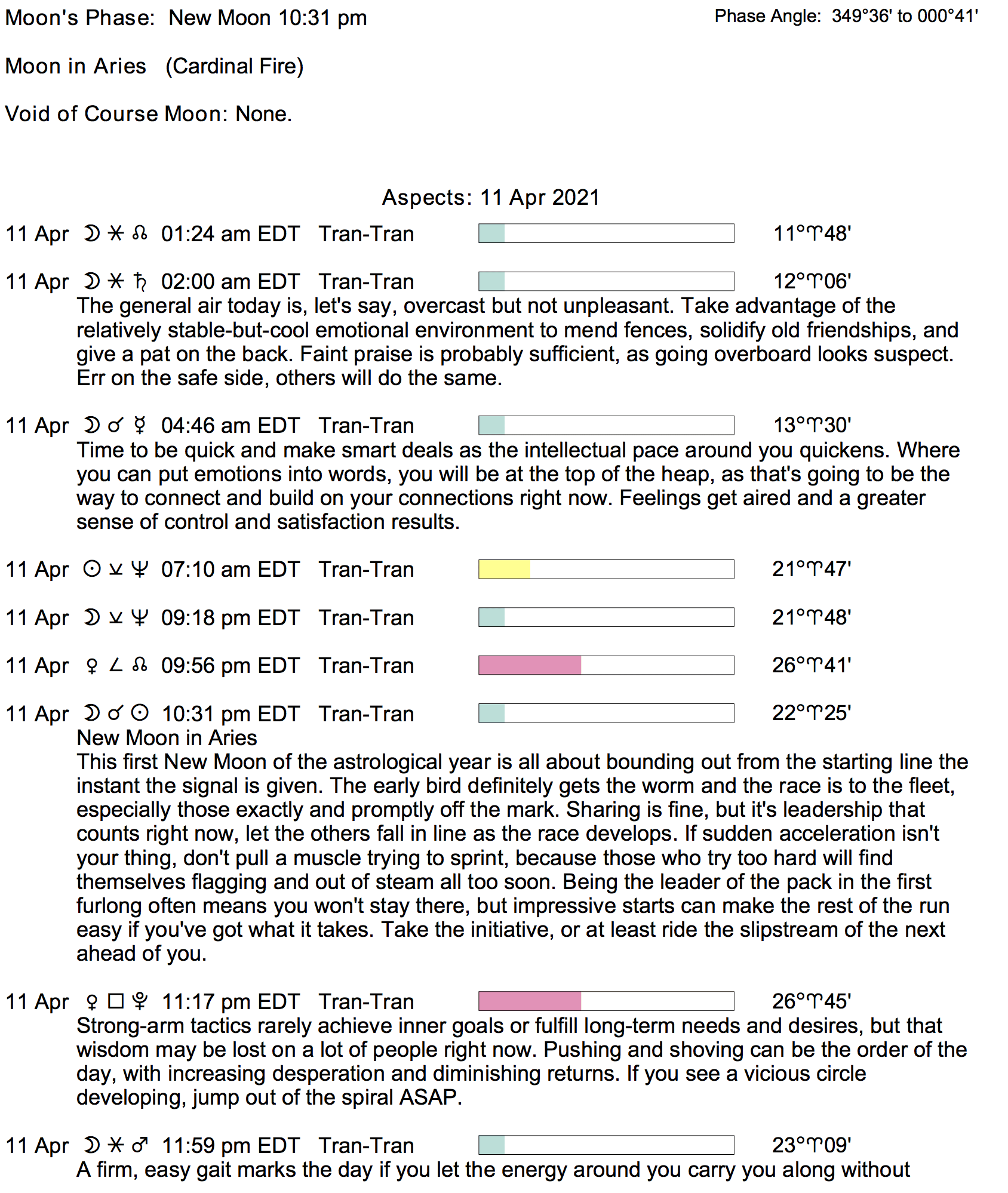 - The New Moon occurs today in the sign of Aries at 10:30 PM.