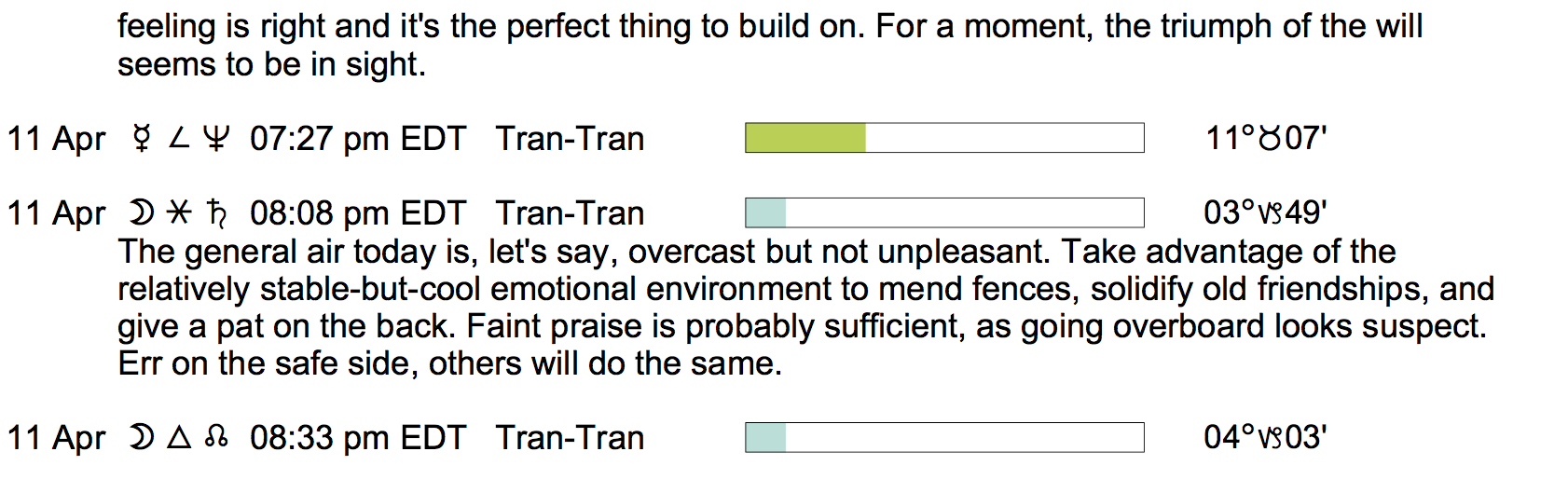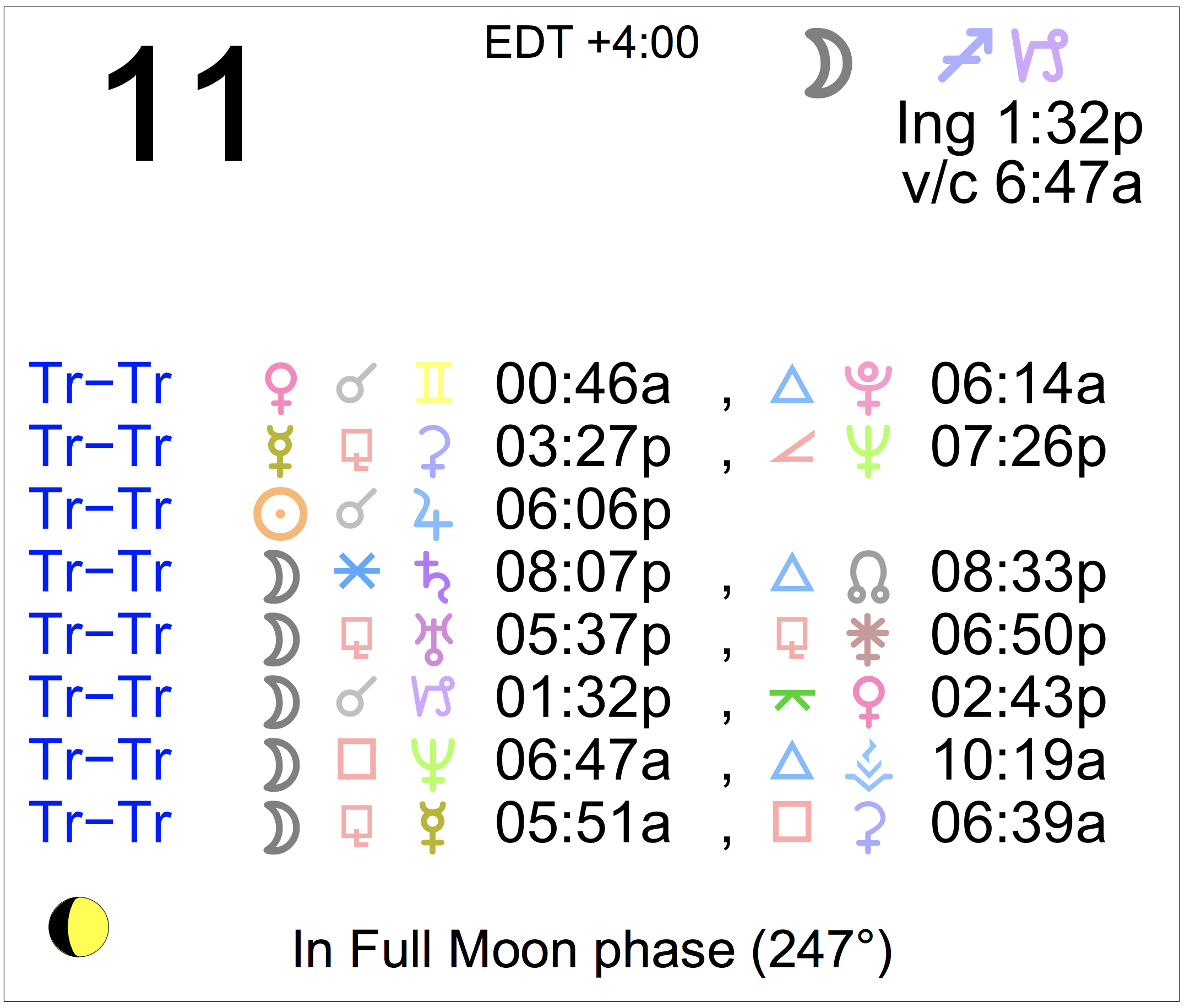Planet Color Key: The longer the bar, the slower the aspecting planet, and the longer the duration of the planet’s transit.