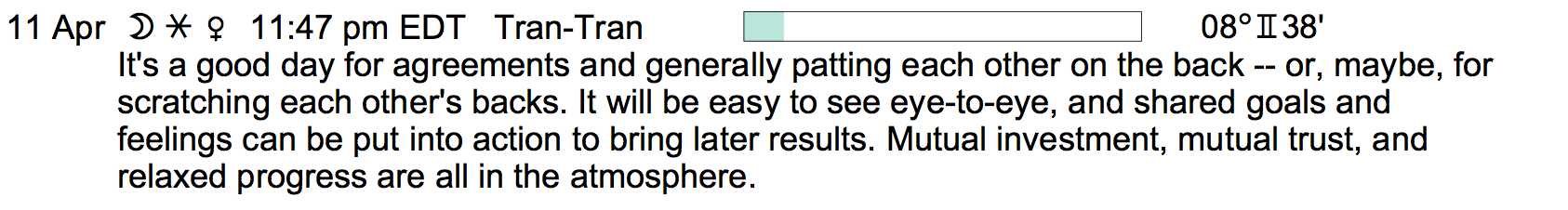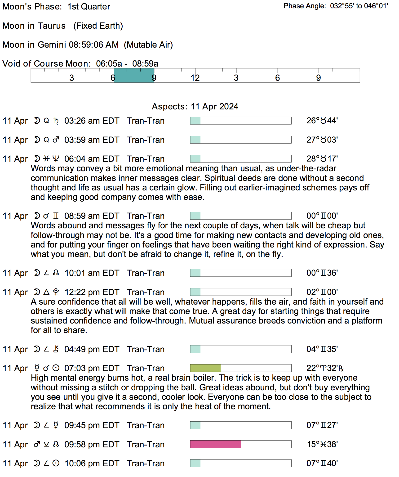 Planet Color Key: The longer the bar, the slower the aspecting planet, and the longer the duration of the planet’s transit.