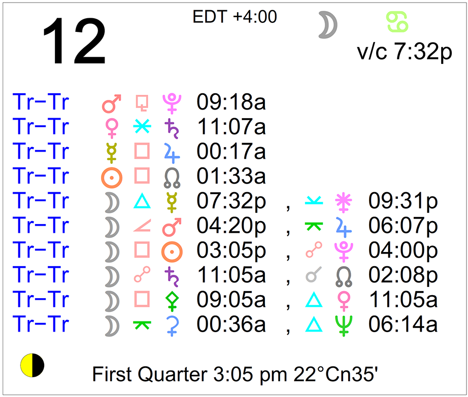 Planet Color Key: The longer the bar, the slower the aspecting planet and the longer the duration of the planet’s transit.
