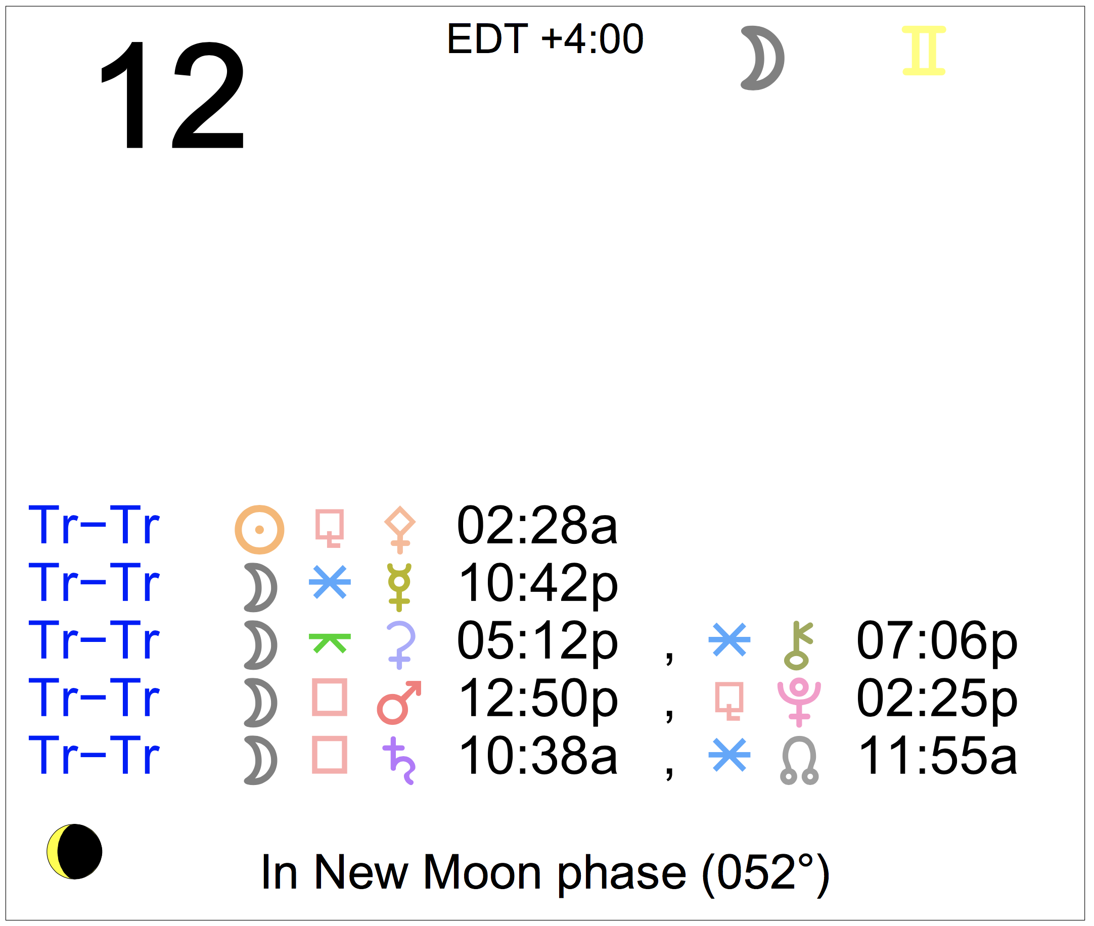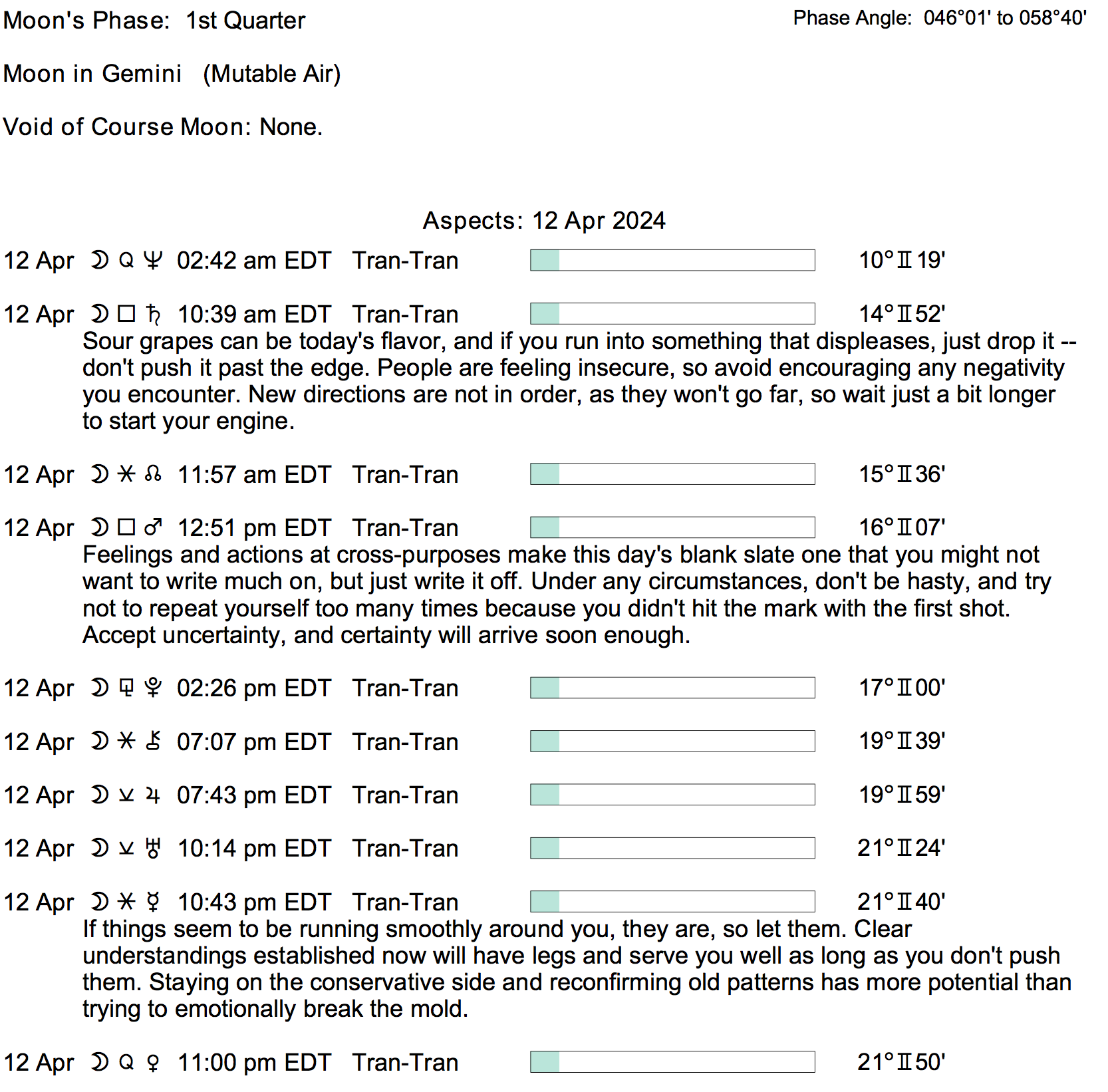Planet Color Key: The longer the bar, the slower the aspecting planet, and the longer the duration of the planet’s transit.