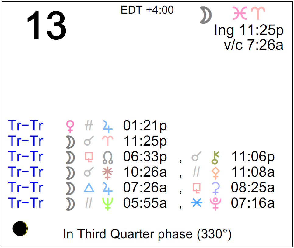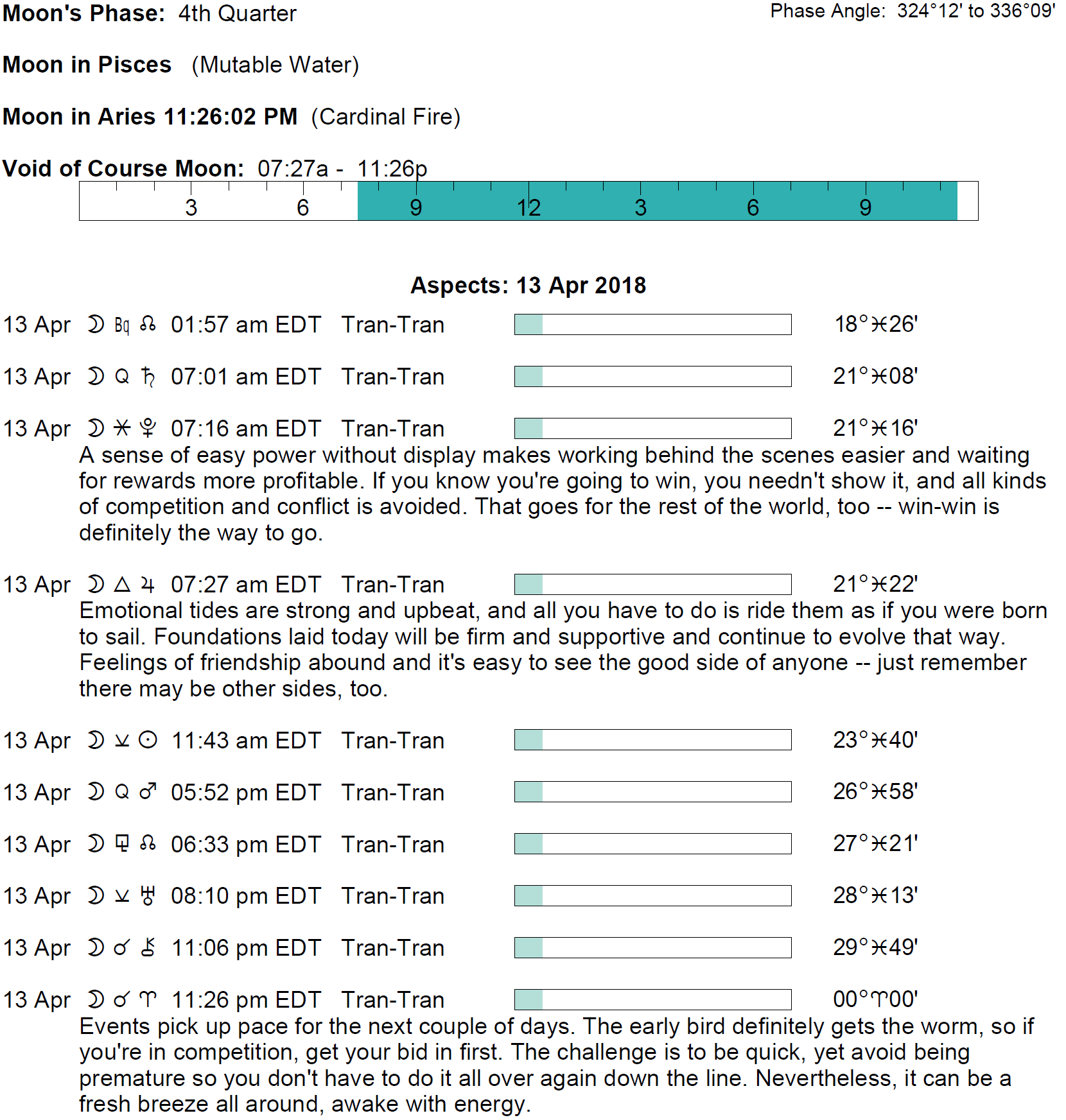The following aspects (major only) and positions are at noon (EDT) on April 13th: