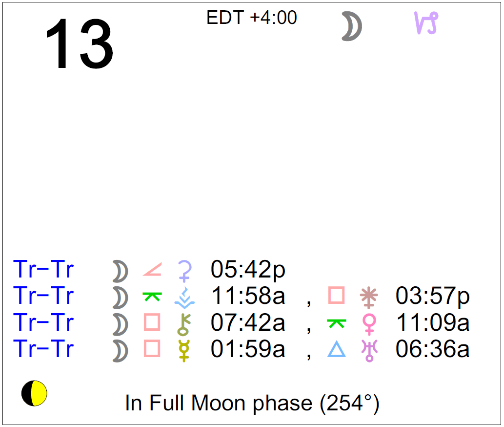 Planet Color Key: The longer the bar, the slower the aspecting planet and the longer the duration of the planet’s transit.