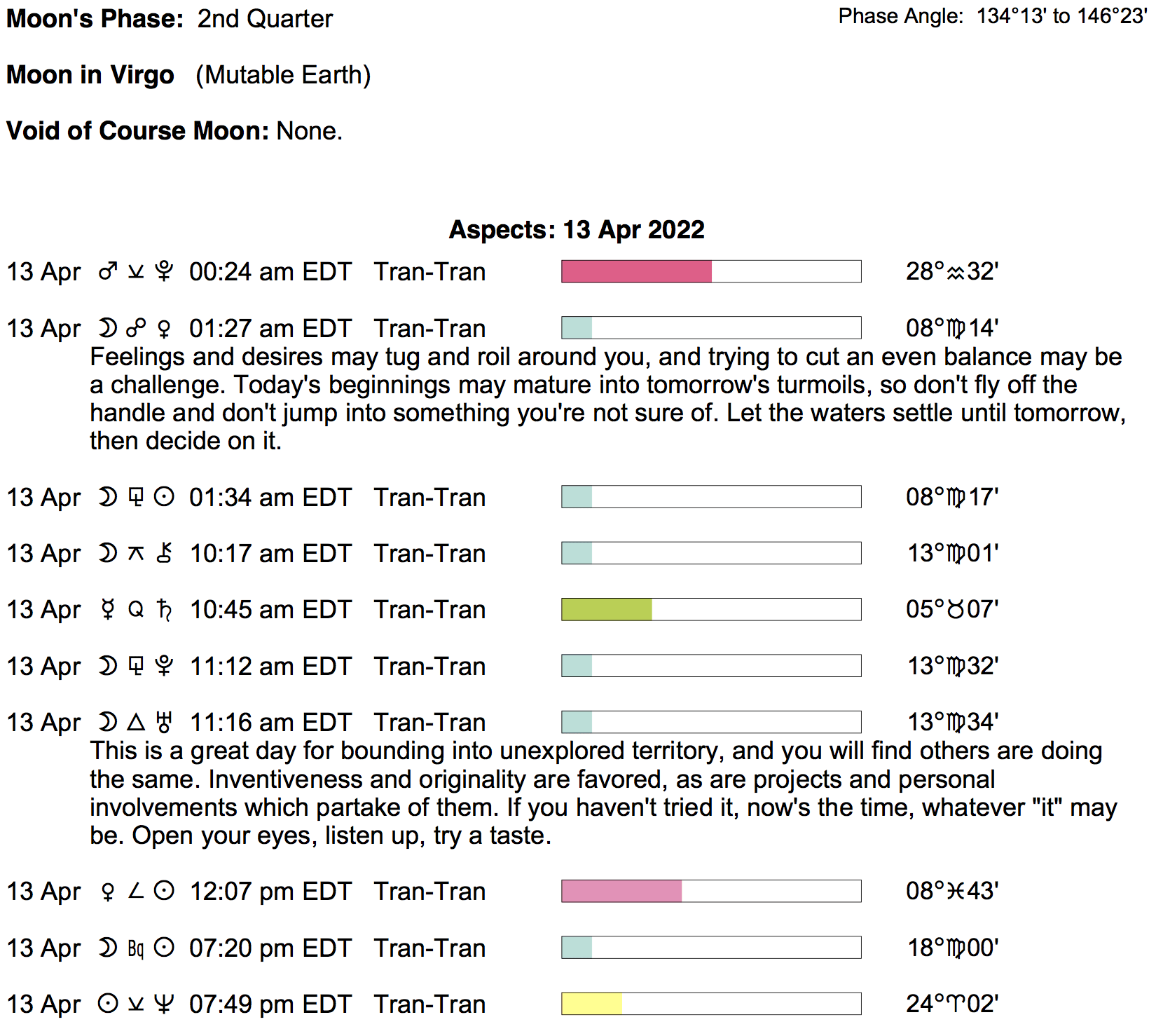 Planet Color Key: The longer the bar, the slower the aspecting planet, and the longer the duration of the planet’s transit.