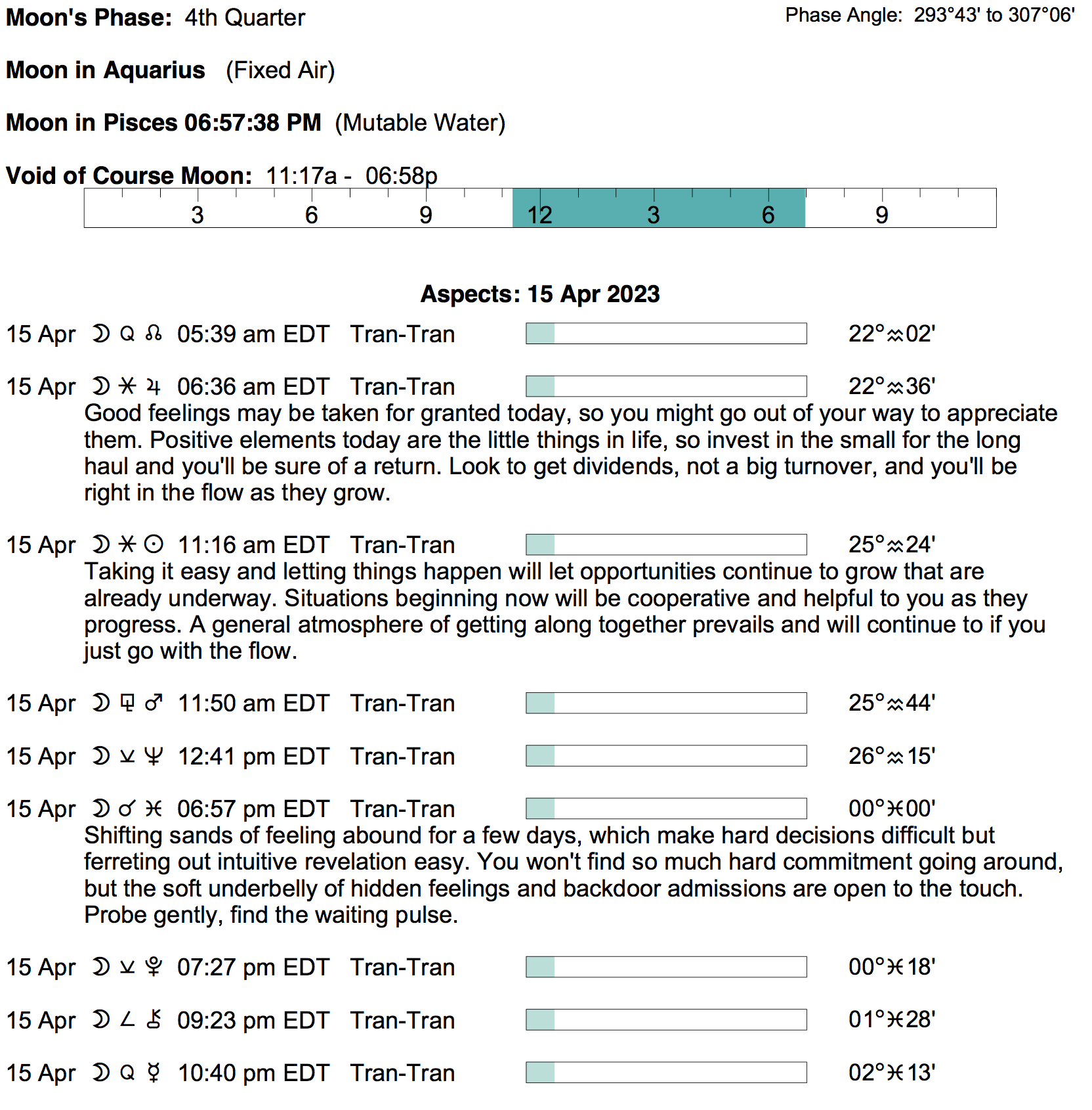 - A void Moon period occurs today from 11:15 AM to 6:56 PM.