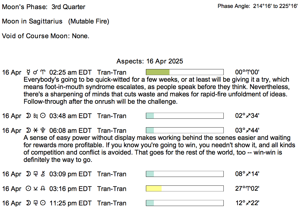 If you’re astrologically inclined and interested in the details of the Astrology of today, here are some of the factors considered in the forecasts:
