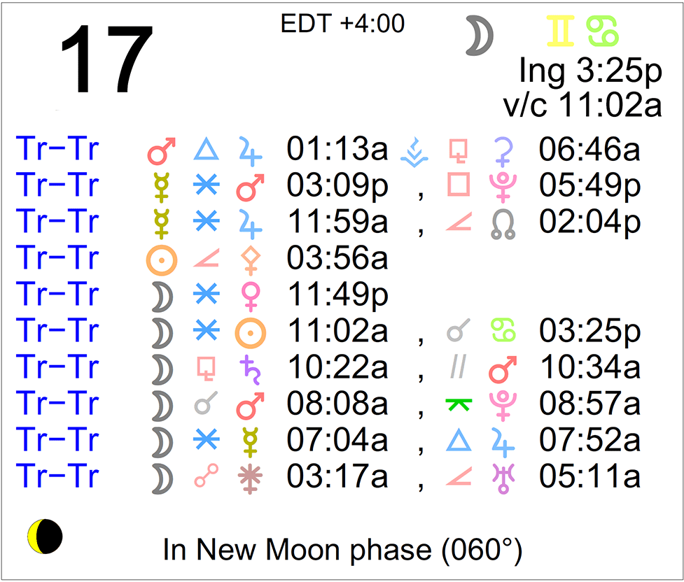 - The Moon is in Gemini until 3:25 PM, after which the Moon is in Cancer.