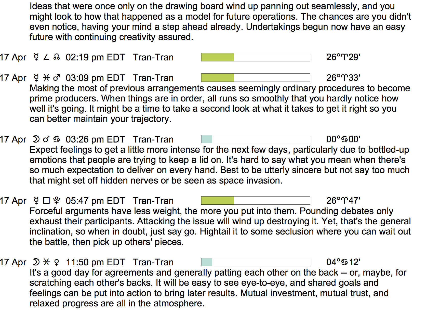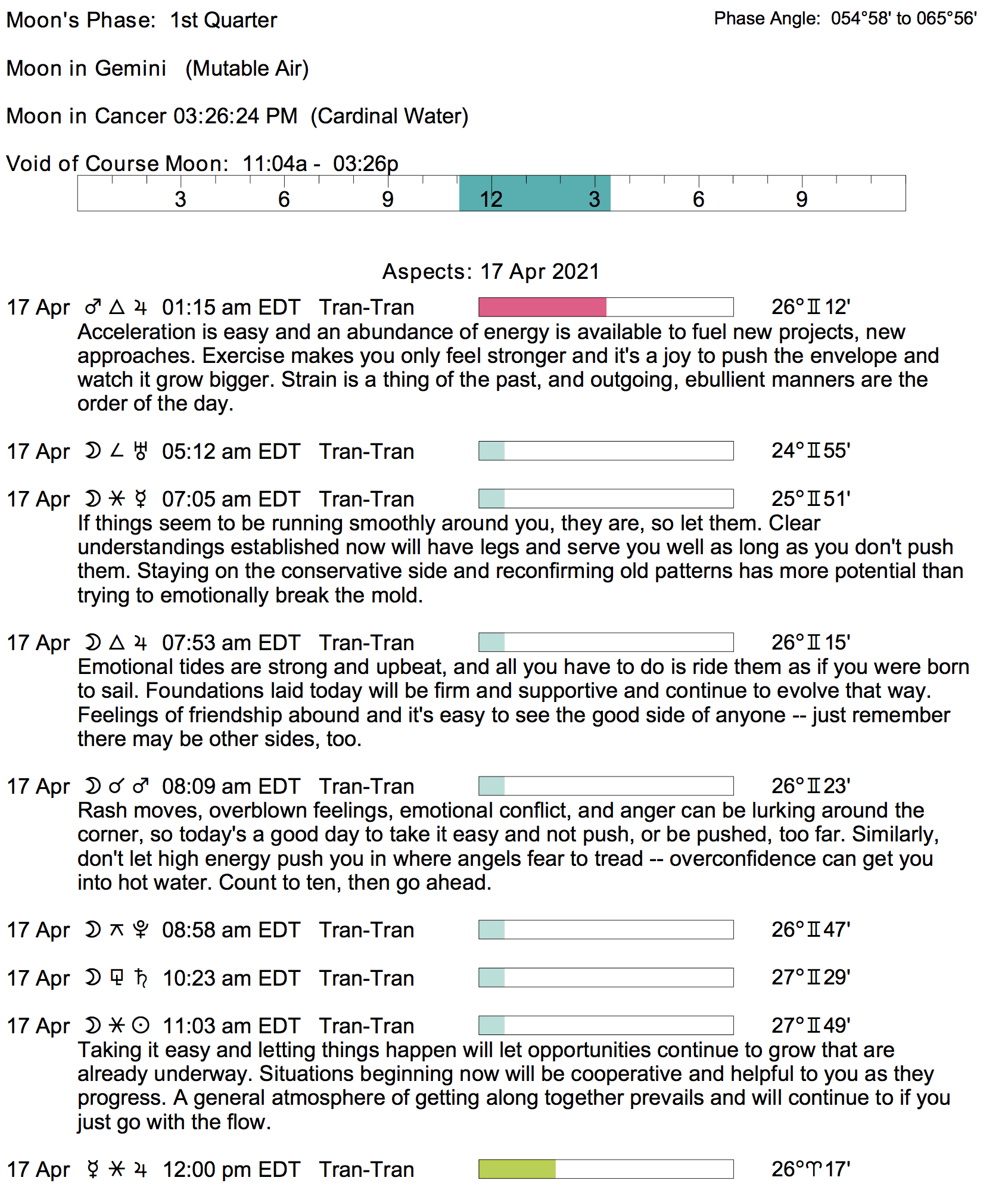 Planet Color Key: The longer the bar, the slower the aspecting planet, and the longer the duration of the planet’s transit.