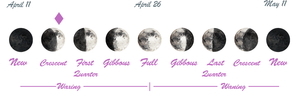 - The New Moon occurred on the 11th in the sign of Aries, and a First Quarter Moon will occur on April 20th.