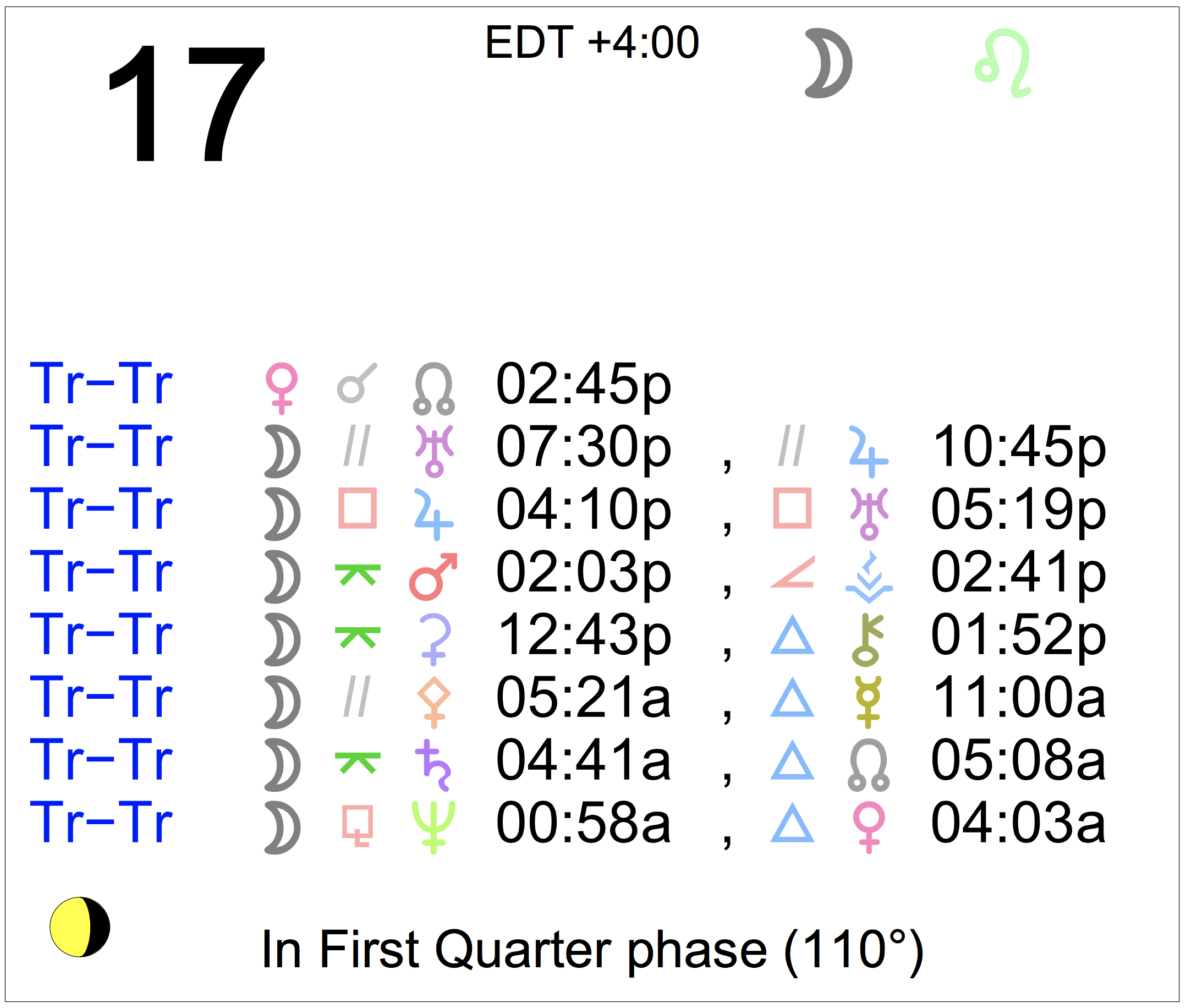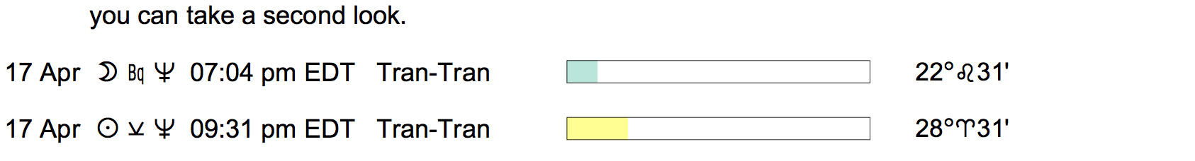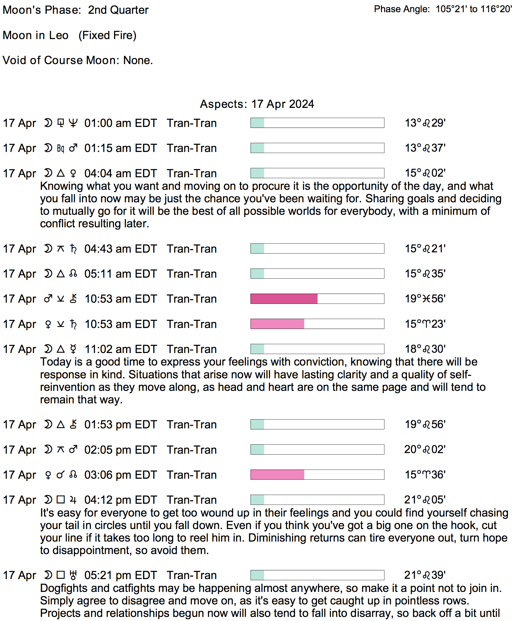 Planet Color Key: The longer the bar, the slower the aspecting planet, and the longer the duration of the planet’s transit.