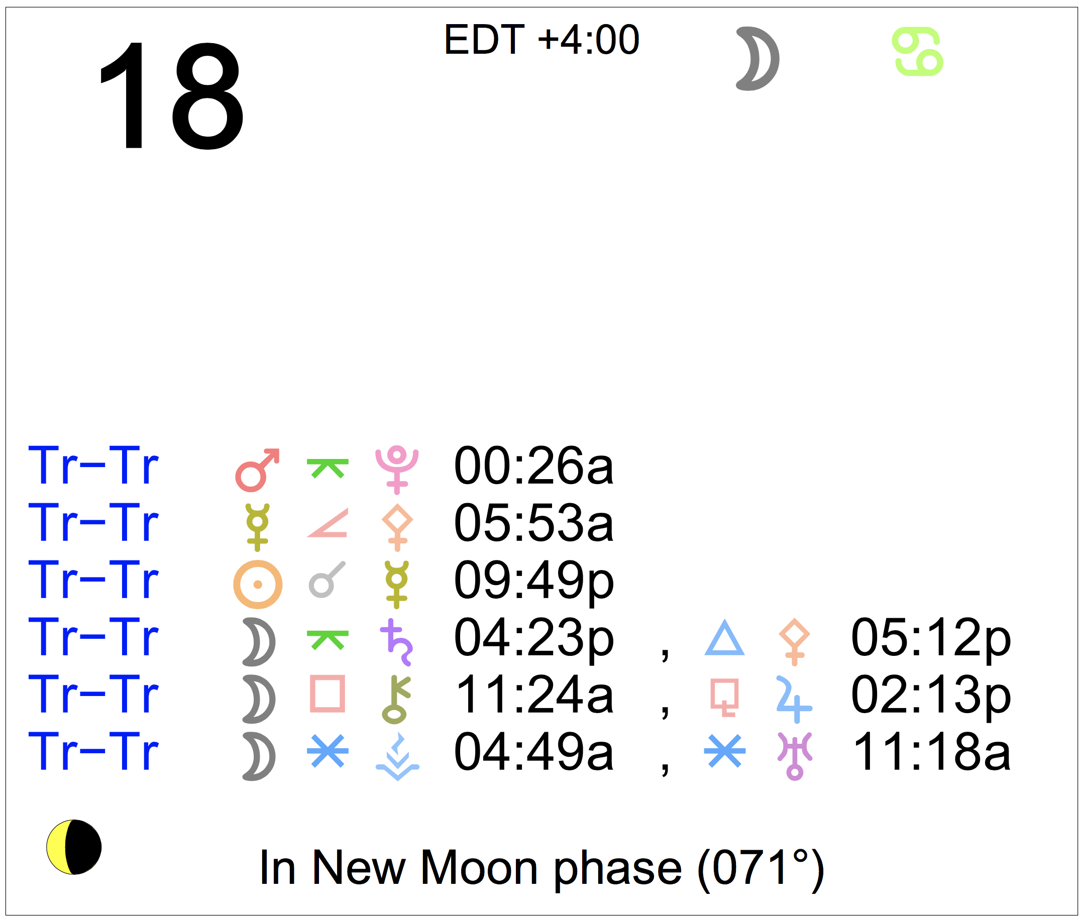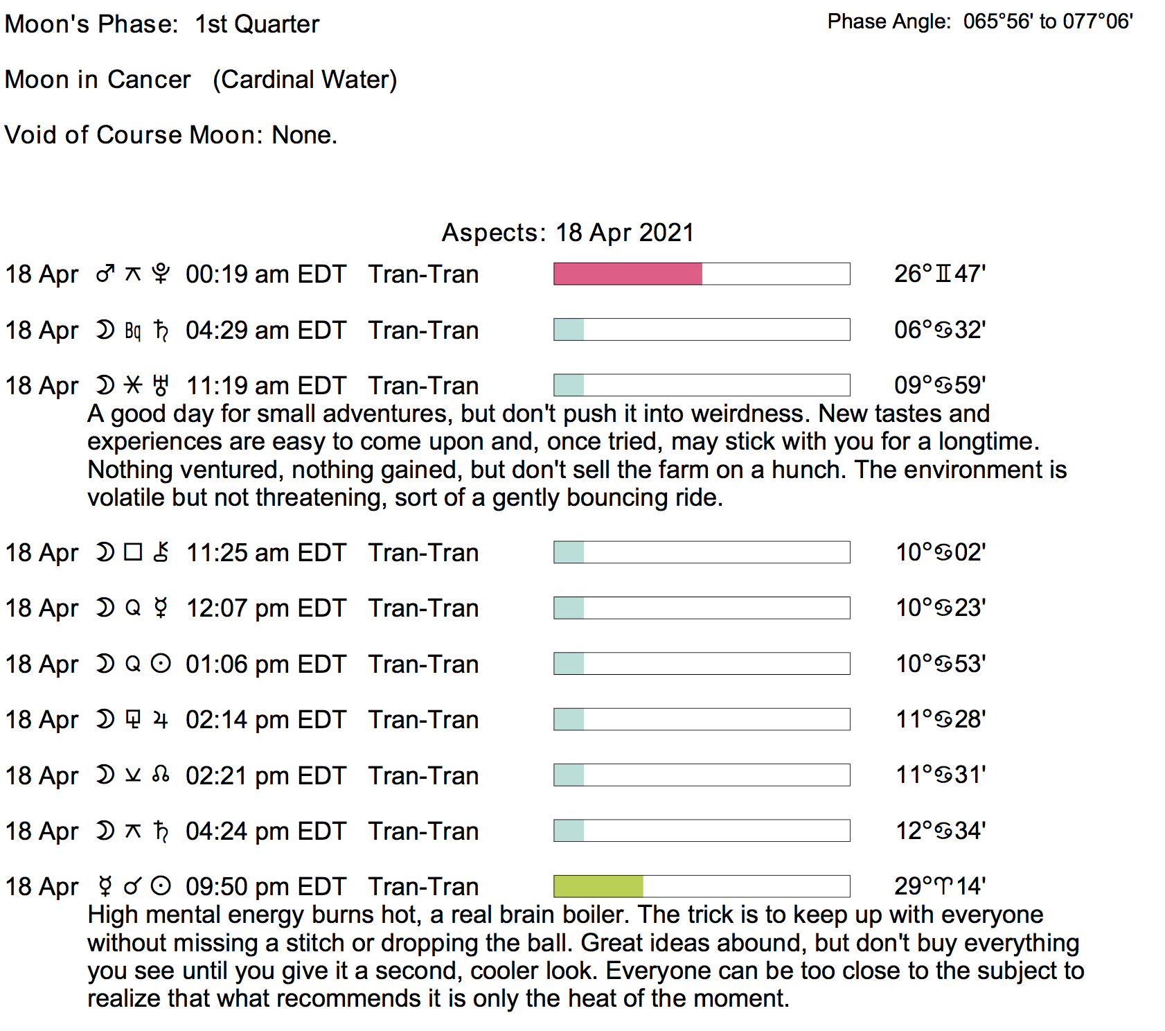 Planet Color Key: The longer the bar, the slower the aspecting planet, and the longer the duration of the planet’s transit.