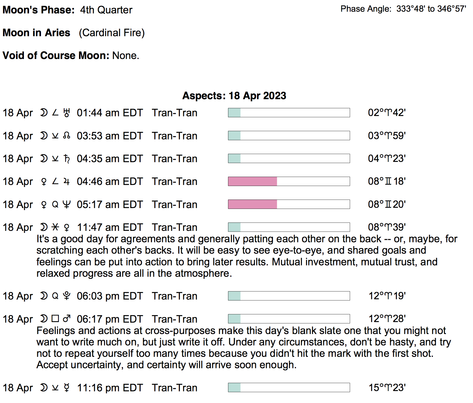 Planet Color Key: The longer the bar, the slower the aspecting planet, and the longer the duration of the planet’s transit.