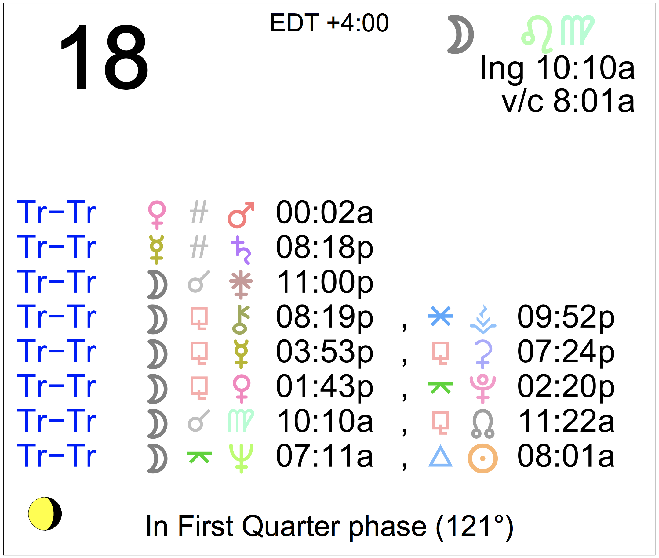 Planet Color Key: The longer the bar, the slower the aspecting planet, and the longer the duration of the planet’s transit.