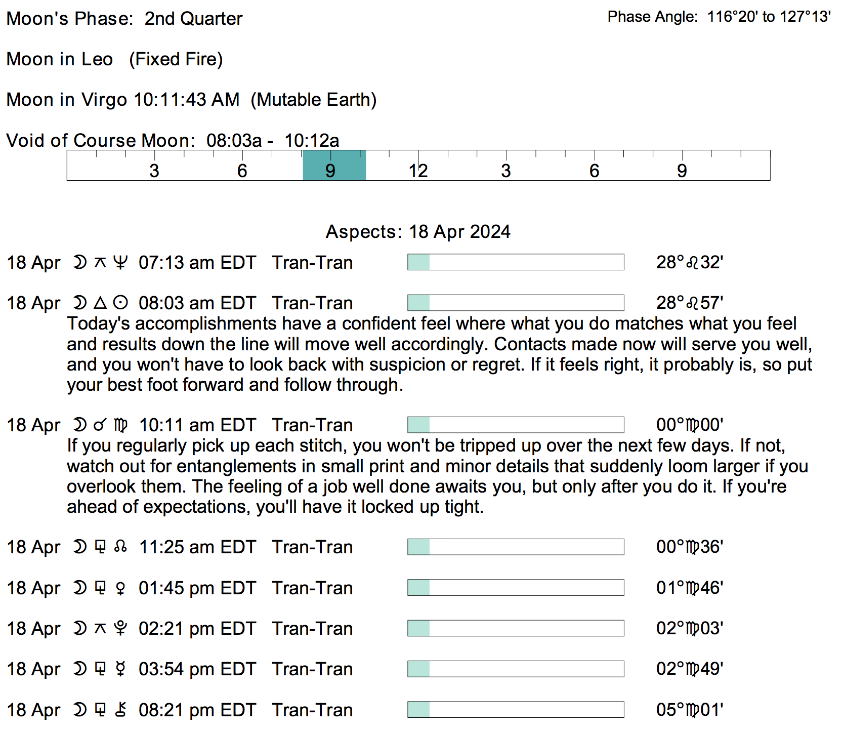 - A void Moon occurs from 8:01 AM to 10:10 AM today.