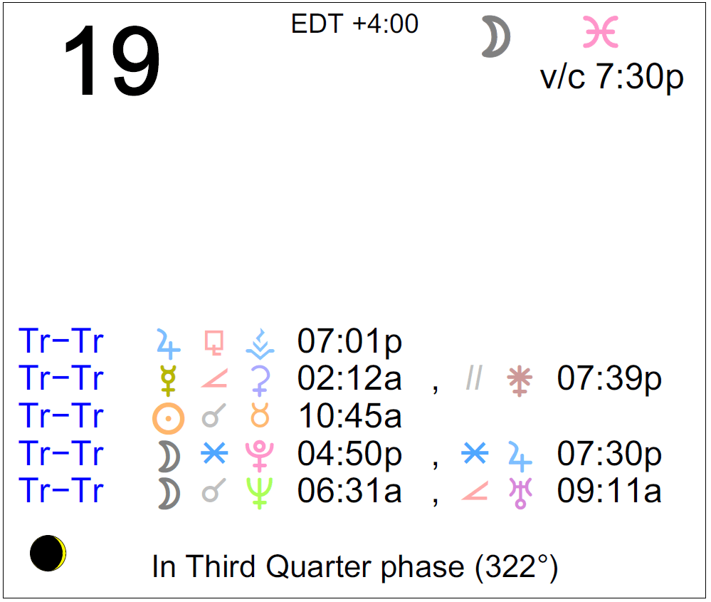Planet Color Key: The longer the bar, the slower the aspecting planet and the longer the duration of the planet’s transit.