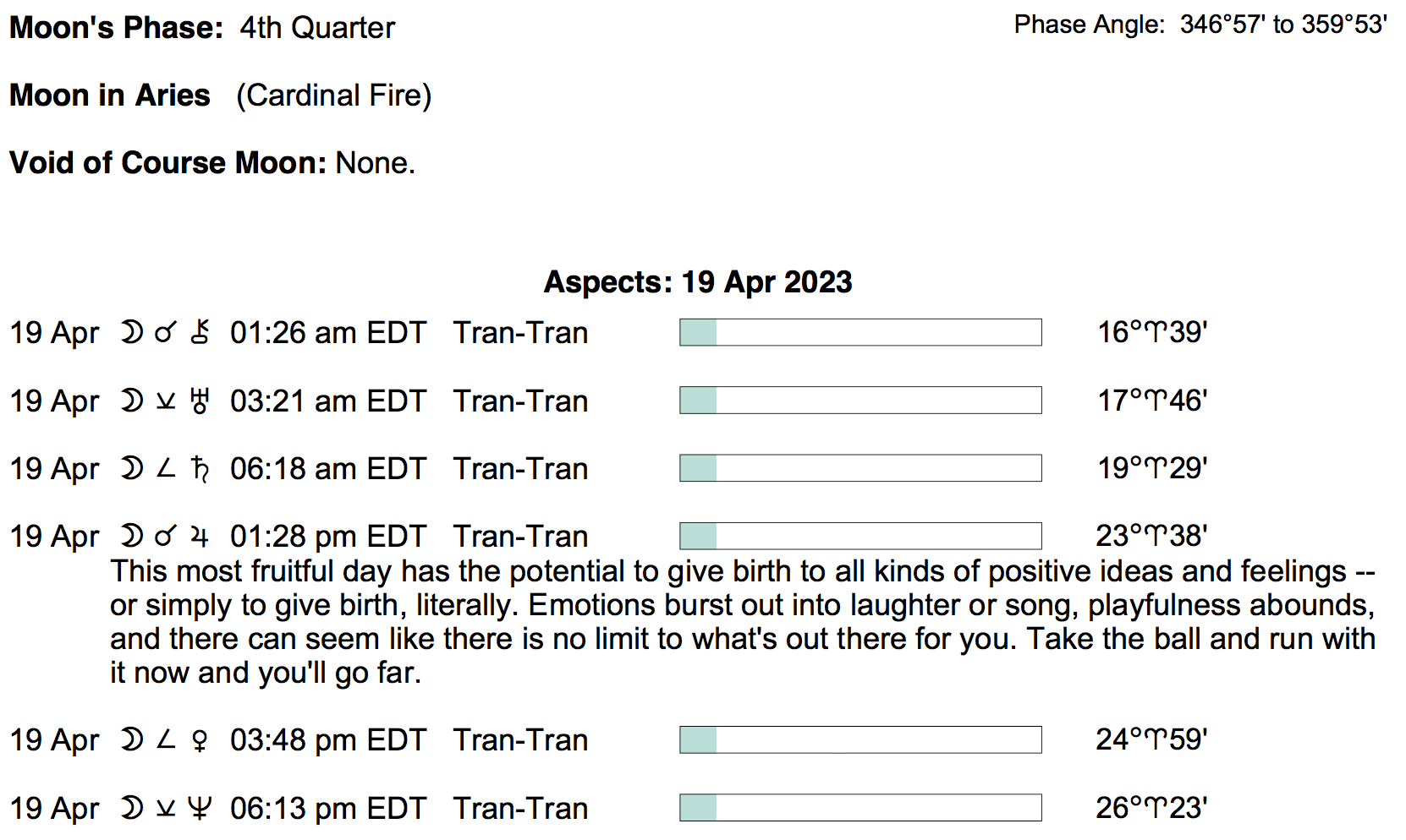 Planet Color Key: The longer the bar, the slower the aspecting planet, and the longer the duration of the planet’s transit.