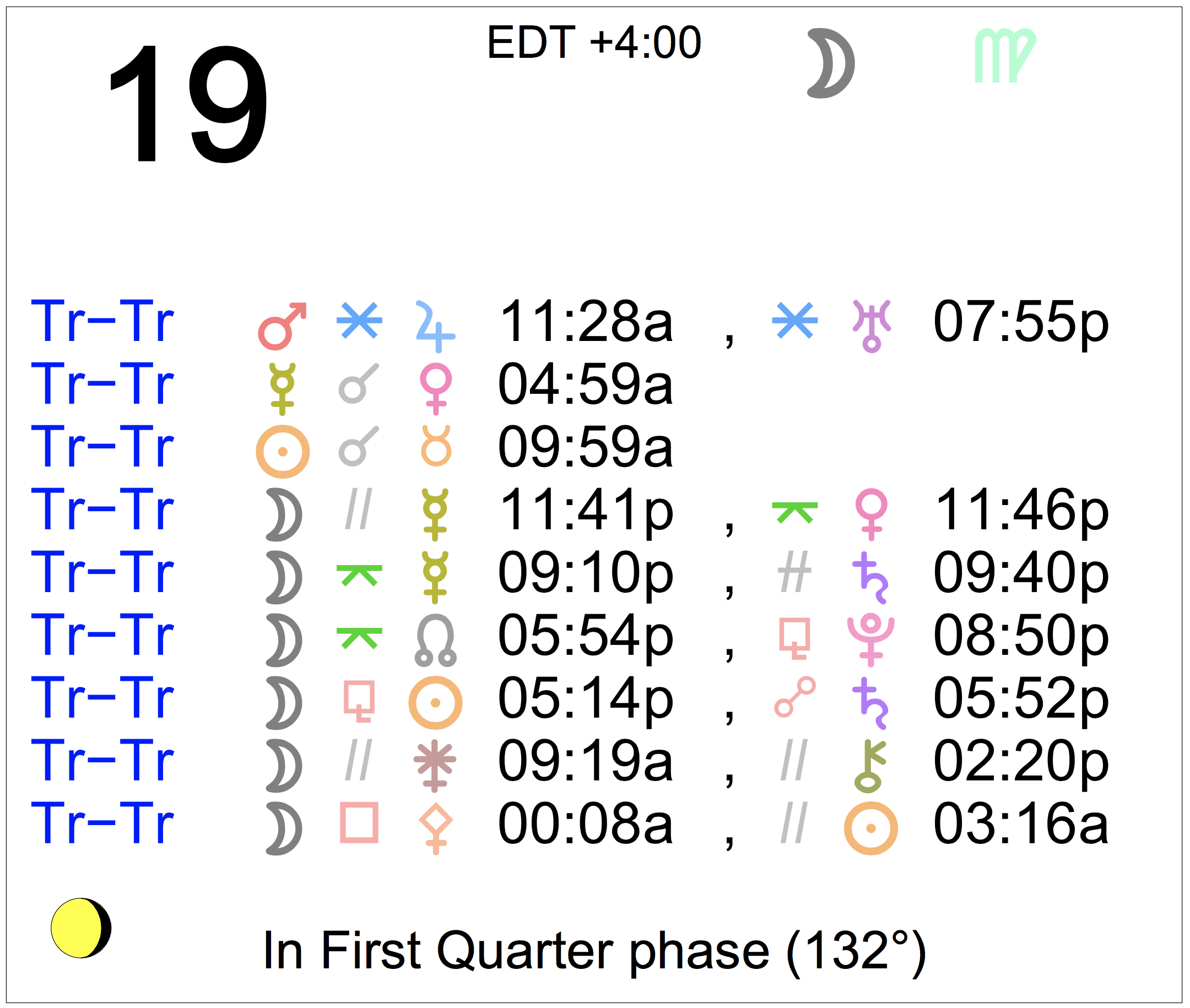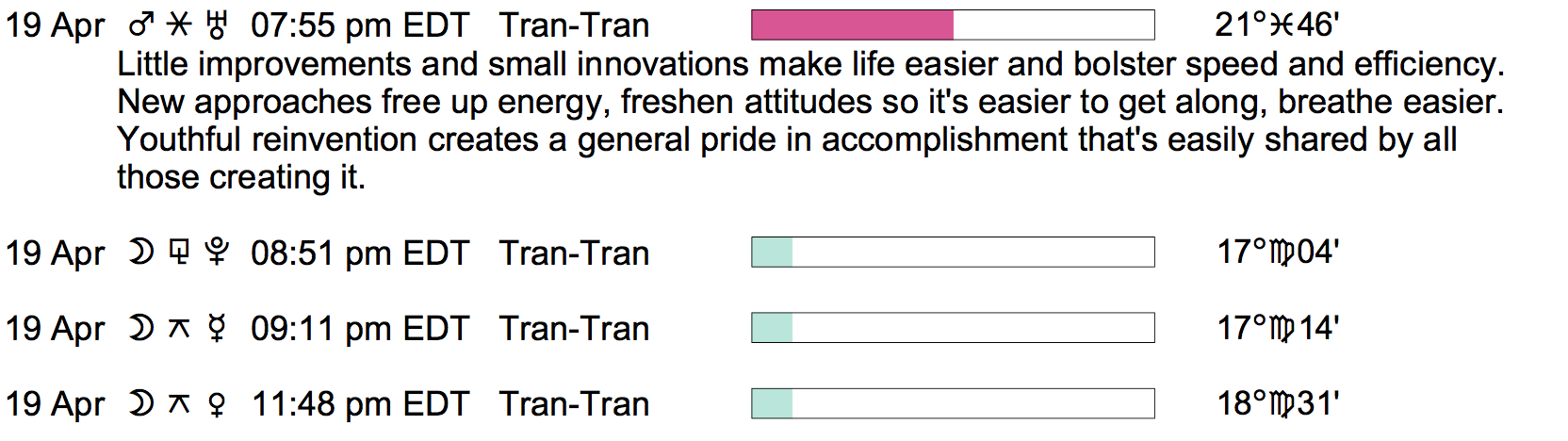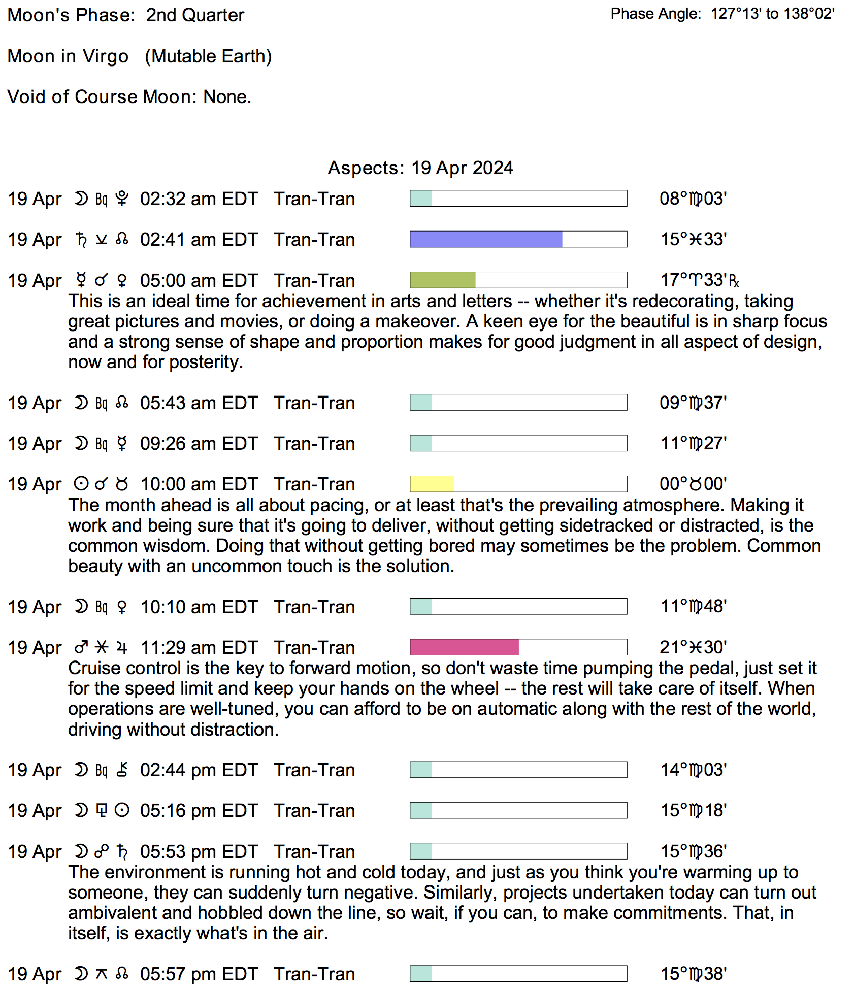 Planet Color Key: The longer the bar, the slower the aspecting planet, and the longer the duration of the planet’s transit.